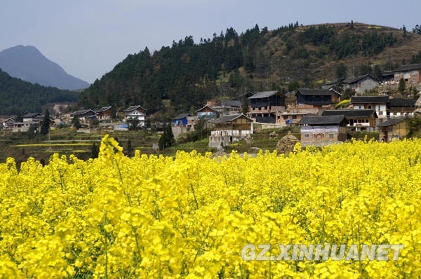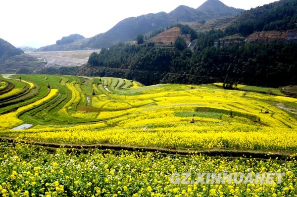 高要村历经几十代人开垦而成的48层梯田,在初春的油菜花海里,呈现出一片片灿烂的金黄色。梯田美景,也在当地苗寨青砖木楼的映衬下,别有一番韵味。金黄的油菜花和葱绿的小麦苗,把梯田装扮成了一条条深浅不一的飘带儿。勤劳的庄稼人们也开始在田间忙碌起来,着手新一年的春耕准备。