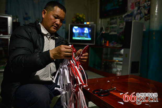 村支书正在制作招龙仪式上需要用到的道具--“纸人”