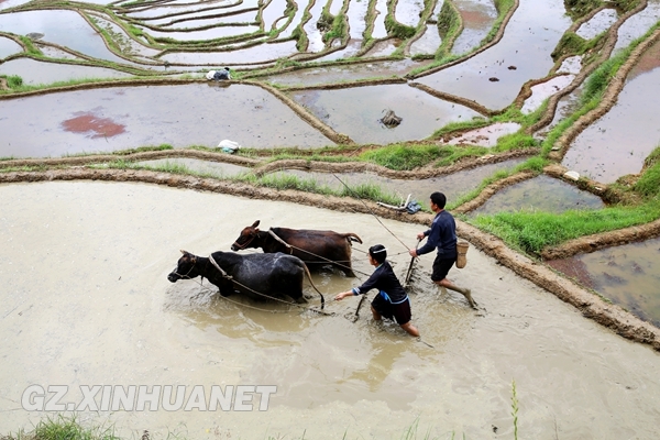 贵州省榕江、从江两县身居在月亮山区的苗族同胞在栽秧耕种时节,田间里时常可见夫妻并列并肩耙田的场景,他们齐心协力抓生产,互敬互助传美德,古老的“夫妻农耕”传统方式沿袭至今。