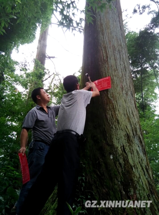 7月28日,榕江县林业工作人员为国家二级保护树种秃杉挂牌。