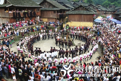 7月30日,黎平县双江镇黄岗侗寨侗族同胞开展祭天、踩歌堂、鼓楼对歌等活动,欢度一年一度的“喊天节”。活动吸引了数万群众和游客前来参加。