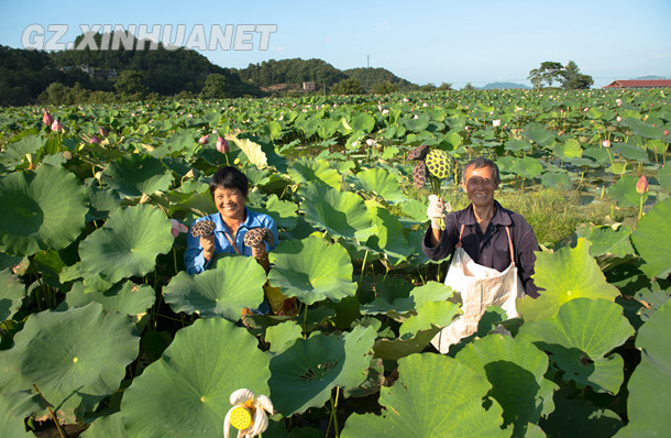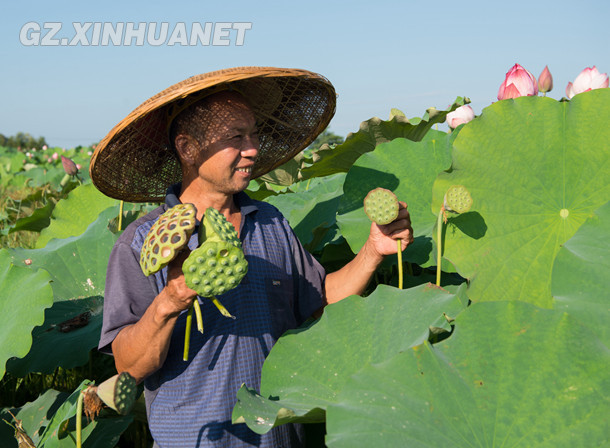 8月10日,天柱县凤城镇朗江万亩大坝“供销社荷花莲子种植示范基地”,民工们正在荷花莲子基地采摘莲蓬。