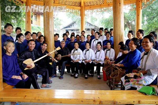 定达侗寨的男女老少在新建的鼓楼下演唱侗族琵琶歌。