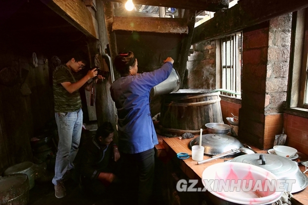 《养老中国》摄制组在榕江县宰荡侗寨拍摄侗家人烤酒。