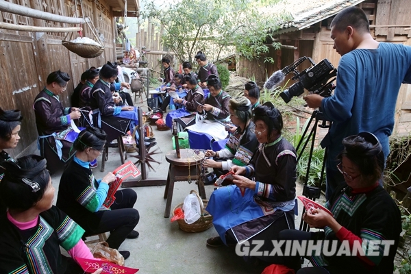 《养老中国》摄制组在榕江县乌公侗寨拍摄侗族刺绣。
