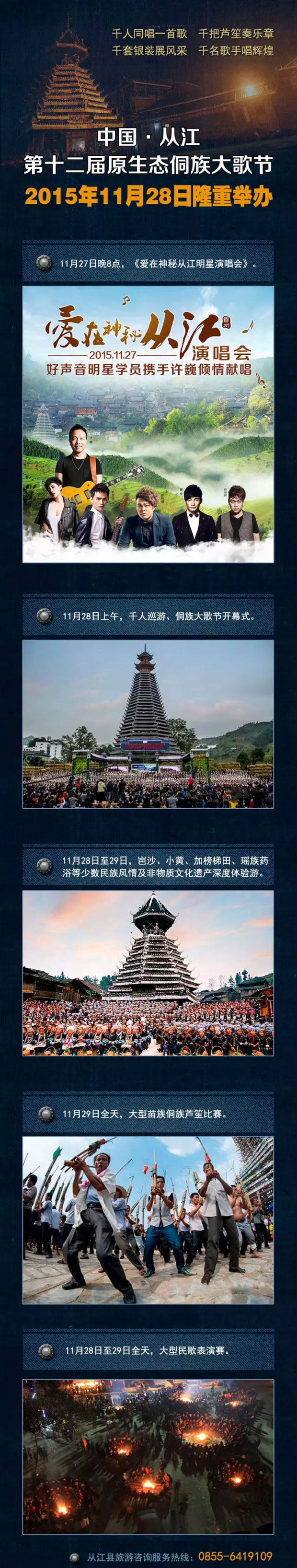 11月28日至29日,从江县一年一度、最大规模、最为隆重、最负盛名的“原生态侗族大歌节”将在从江县城隆重举办。今年的侗族大歌节以“养心圣地·神秘从江”为主题,依托浓郁的民族文化资源,向海内外游客展示从江原生态民族文化魅力和特色产品。届时,将隆重举办侗族大歌百村歌唱大赛、苗侗族芦笙赛、民歌表演唱、岜沙苗寨风情体验游、小黄天籁之夜、高华瑶族药浴体验、加榜农耕文化观光之旅等一系列原生态民族民间活动。11月27日晚,中国著名歌手许巍将携中国好声音明星学员在从江县民族一中体育场隆重举办“爱在神秘从江明星演唱会”,激情高歌,精彩不断。