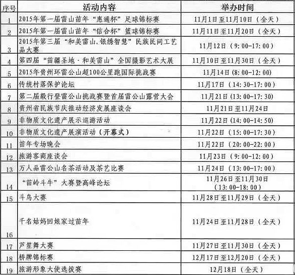 贵州旅游在线讯 近日,记者从中共雷山县委、县人民政府了解到,2015年中国.雷山苗年非物质文化遗产展示活动于11月1日至12月30日(农历9月20日至11月20日)举行。2015年雷山苗年节活动内容、持续时间为历届之最,有十九项文化活动,持续时间两个月整。