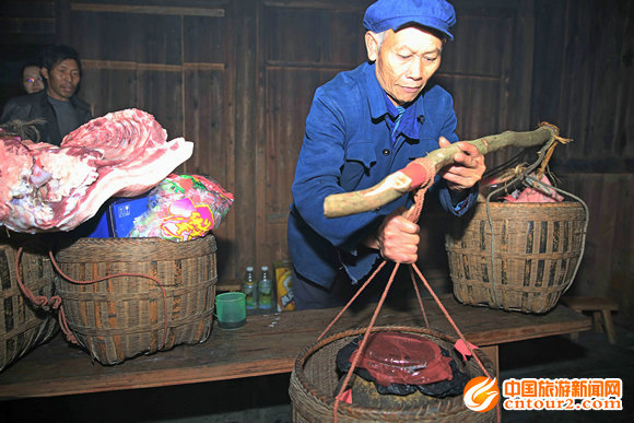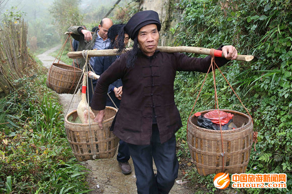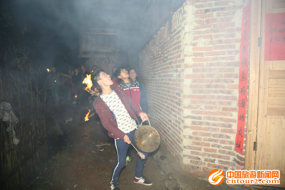 “咣”!麻买诶!、“咣”!麻买诶!……,新娘家楼脚传来一阵喧闹声,一大群青年男女手持长长的火把、敲着铜锣,时不时燃放一小挂鞭炮,让小广村顿时沸腾起来,拉开了剑河县磻溪镇小广村侗族十月头卯集体婚俗的序幕。