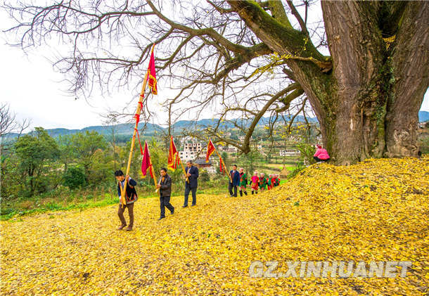 每到深秋,金黄的银杏叶洒落在树下、树旁,就好像给大地铺上了一层厚厚的黄金地毯,非常漂亮;这个时候,金庄村的村民们也常常在树下吹起芦笙,跳起欢快的芦笙舞,庆祝一个个丰收年,同时,这一难得的美景也吸引了众多的中外摄影爱好者前来观光、采风。