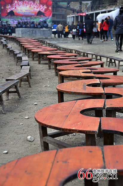 长桌宴沿着斗牛城空旷地一字摆开,旁边坐满了当地寨老和村民、从外地赶回家乡过年的农民工,还有专程赶到侗寨过大年的中外游客,共约1000余人。