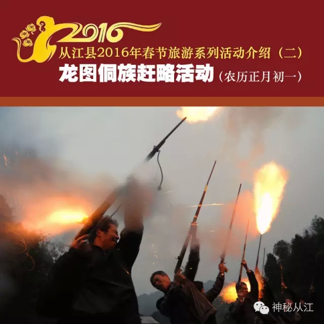 从江县贯洞镇龙图片区侗寨每年正月初一都要举行盛大的“赶略”活动。赶略即赶走“侵略者”,祈求平安之意。活动当天,村寨家家户户杀猪宰牛、男女老少穿着侗族盛装举行隆重的“祭萨”活动后,扛着火枪把“魔兽”驱逐出寨,男女老少齐聚田坝,朝天鸣放火枪,庆祝侗族领袖“萨”带领农民群众取得战争的胜利之情。