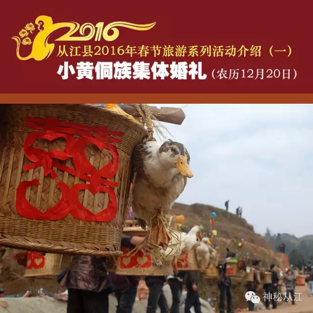 贵州省从江县小黄村每年都要举行一年一度传统集体婚礼。按小黄村的传统规矩,全寨当年结婚的青年男女要集中在这一天办喜事,时间一般是腊月二十至二十八期间择日举行。当日早八点至十点,所有新娘不用媒婆带领,独自一人走着从娘家去婆家,然后桃一担井水回家,就是婆家的人了。婆家和娘家则杀猪宰牛设宴款待亲朋,全村老少都来帮忙的与前来贺喜的人边喝边唱,喜筵延续三天。小黄的集体婚礼仪式非常简单,但婚宴则非常隆重!