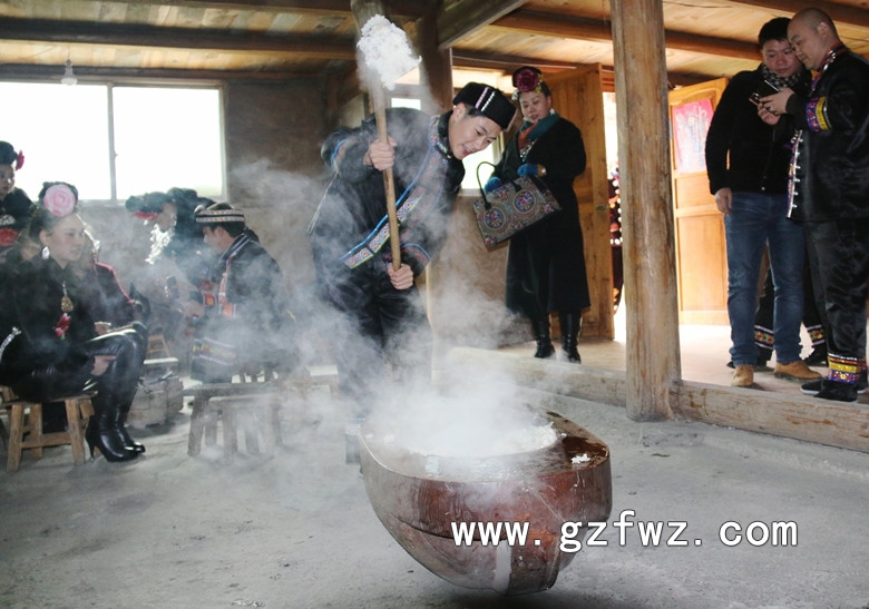 据悉,打糍粑是苗家人逢年过节的一种传统习俗,每到年关,就会听到苗寨里响起此起彼伏的快乐“打糍粑协奏曲”。 打糍粑象征团团圆圆,寓意乡民对亲情和友情的看重,寄托着苗家人民团团圆圆过新年的美好愿望。