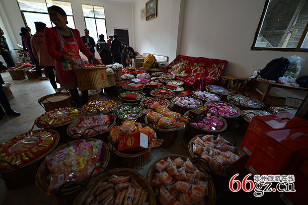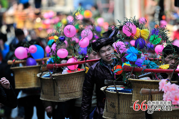 贵州旅游在线讯 2016年2月10日(正月初三),从江高增乡正在举一场隆重的侗族婚礼,亲朋好友按传统送来的礼品有200余担,几百人参加,除了摄影人还吸引了来自北京、上海的旅游团队。从江春节期间丰富的民俗活动深得游客喜爱。