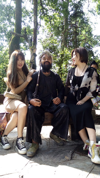 岜沙火枪手和美女游客的合影,画面充满矛盾冲击之美。火枪手坐在中间毫不怯场,尽显王者之风;美女游客分做两边,与其互动逗笑。你可以说这是传统与现代的冲击,也可以看作是民族与时尚的定格。拍摄者抓拍到了最自然生动的一瞬间,毫无扭捏,这也是手机拍摄最大的优势吧。