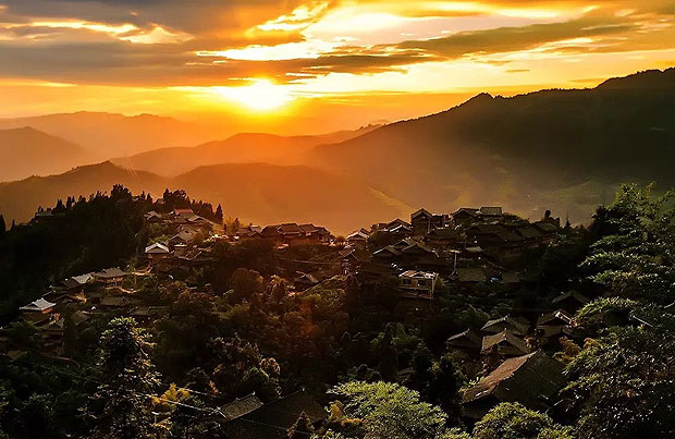 架里村位于从江县停洞镇东北面,是一个有着历史文化传承的苗族聚居村,沿袭着民风淳朴,热情好客的传统。作者在至高点拍摄了架里晚霞,整幅作品充满了浓浓的暖意,村落、森林、远山、夕阳,所有美好的内容都进入到了画面里,给人无限遐想。