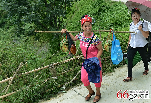 苗族妇女乐滋滋挑起西瓜和公鸡来到交榜村亲戚家过抬狗节