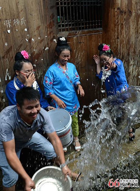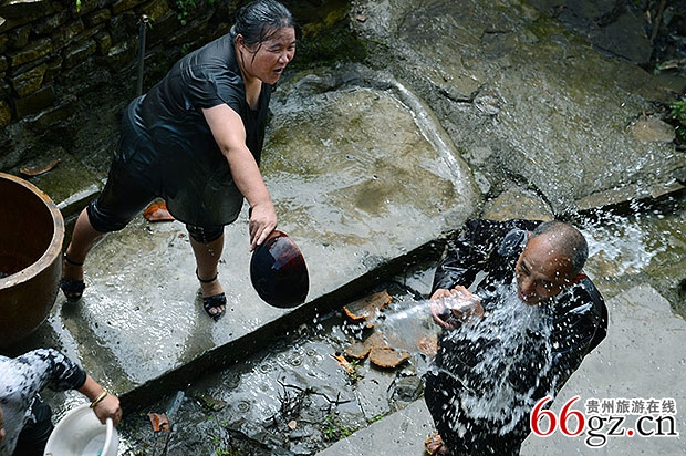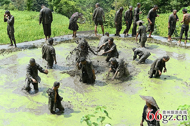 交榜村苗族村民抬着狗,敲着锣鼓在水田中打水仗