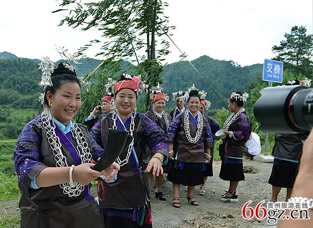 交榜村的苗族妇女聚集在村口等待客人喝拦门酒