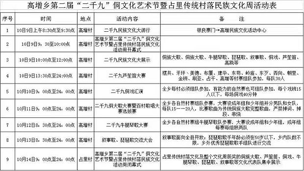 1、2016年10月9日至13日,高增村(高增乡第二届“二千九”侗文化艺术节暨占里传统村落民族文化周开幕式及相关文化活动)。