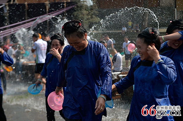 或许是中午的气温,一点也不比侗族同胞们的热情逊色的缘故。看着侗寨帅哥、美女和小朋友们在广场扁水的欢呼声,来自不同地方的游客们再也按耐不住火热的内心,大家纷纷拿着侗族同胞送来的塑料盆、水枪等“扁水武器”,开始了相互的泼水嬉戏和水枪激战。扁水狂欢节气氛也随着游客高涨的情绪被推向高潮,一直持续到太阳低头为止。