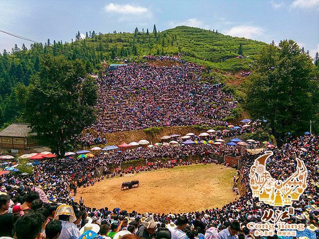 斗牛是从江少数民族一项传统的竞技活动,它的历史由来已久,据说最早可追溯到三国时期,至今已有近两千年的历史。停洞镇是从江县的斗牛之乡,斗牛一般逢农历的“亥日”或喜庆节日举行,一次激烈精彩的民间传统斗牛赛,常常会吸引数万人坐山观牛斗,场面非常壮观!