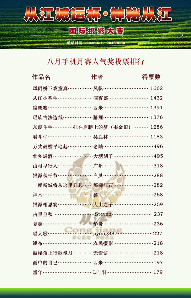 “从江城运杯·神秘从江”国际摄影赛手机八月赛已经结束,经专家评审团的评选选出了20幅入围作品,又经网友历时五天时间投票产生了5名最佳人气奖,八月手机月赛结果新鲜出炉,现公布八月手机月赛人气奖投票结果。