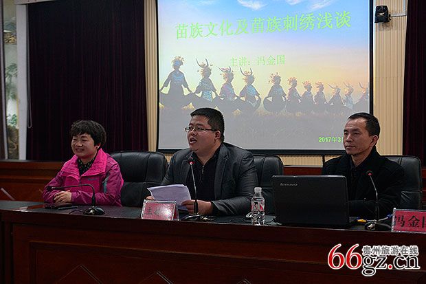 随后,文化产业办公室主任冯金国给学生上了一堂“台江苗族文化”的非遗课程。其内容包括苗族发展渊源、民族服饰刺绣、苗族纹样剪纸等。让学生在深入到村寨之前,对台江苗族文化有一个大致了解。