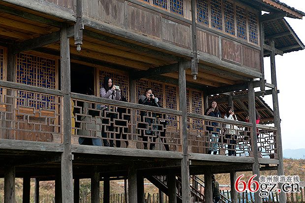 学生在吊脚楼上拍摄风景