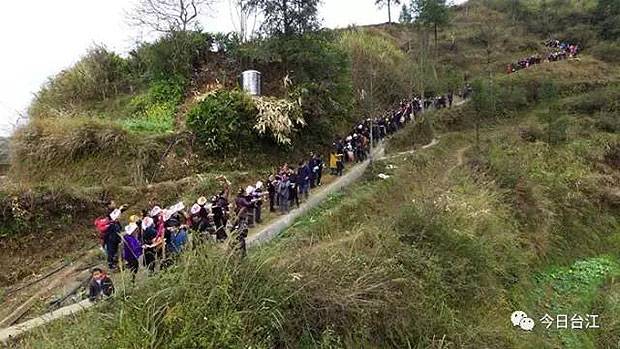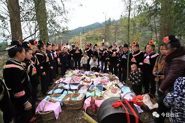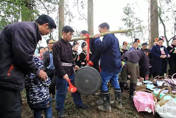 3月10日,是九摆村招龙节第一天。该村举办神秘的传统招龙仪式。村里杀猪宰牛,迎接龙神。当天上午,全村130户,每户青壮年男人结队跟着鼓藏头上山“招龙”。据说,龙神盘踞在全村地盘最高的山脉上,需要全村男人在山上祭祀龙神,千呼万唤,请求龙神下山。