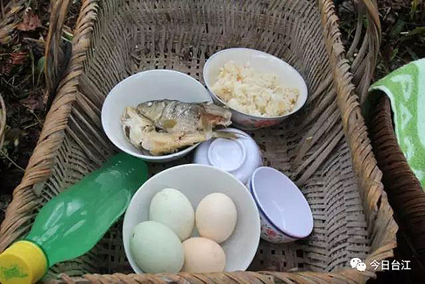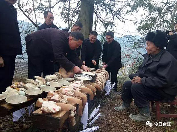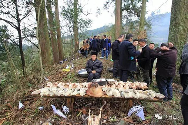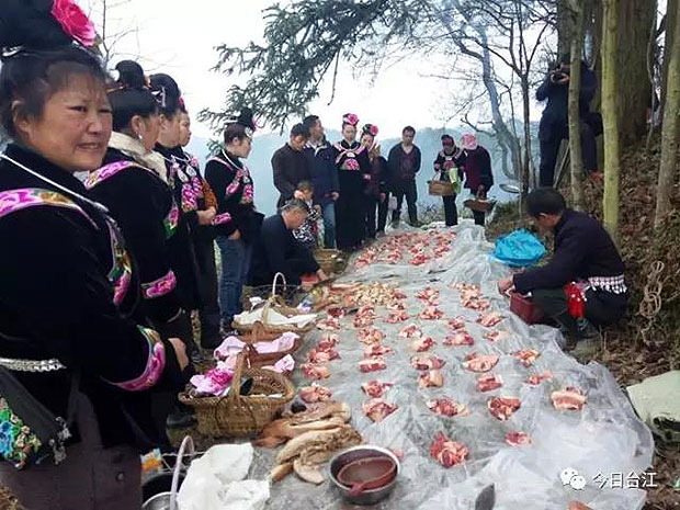 这时,龙潭边两口铁锅祭祀肉品已经煮熟,村民有的把剩下的生肉切块摆放好,有的把熟肉品分成12份摆放在祭祀木凳上,同时还摆放田鱼和熟鸡蛋。祭师坐在旁边念念有词,祈求龙神保佑全村人丁兴旺,五谷丰登,幸福安康。仪式结束后,全村每家每户领一份“龙肉”“龙汤”带回家,完成龙神引进家。