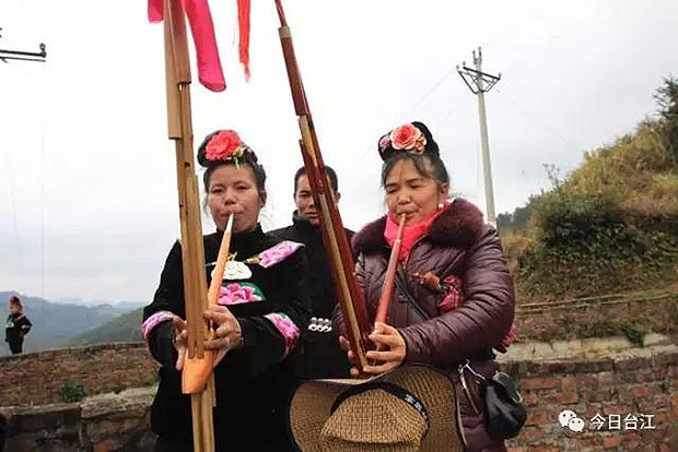 当天下午两点,每家妇女手里提着装有米酒、田鱼、鸡蛋等祭祀品的竹篮陆续聚集到村里的龙潭山上等候龙神的到来,并把祭品竹篮集中摆放到村里的龙潭山坡古树脚下。妇女们身穿便装新衣全部爬到“龙神”回来的路口上一字排开等候招龙队伍下山。当听到铜鼓敲得满坡响,芦笙吹得呜呜叫时,只见鼓藏头拉着一只公鸭走在最前头,招龙队伍紧跟着欢天喜地下山来到路口,全村妇女用米酒迎接。妇女们纷纷给鼓藏头和招龙队员敬酒,迎接龙神到来。随后,全村成年男女集中在龙潭山上祭祀龙神。