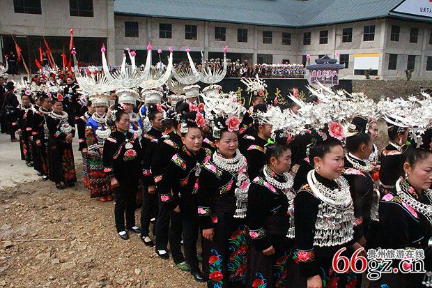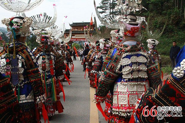 4月28日天阴转晴,阳光明媚,来自全乡14支身穿银饰盛装的游演队伍早早地来到九摆村贵州高原生态茶叶加工有限公司的驻地集中。上午9点10分,队伍浩浩荡荡从这里向九摆播铥(上寨)踩鼓场进发,一个小时后汇集在九摆播铥的踩鼓场,此时,游演队伍灌满了整个踩鼓场,使这里人头擅动,飞歌悠扬,银饰声、铜鼓声、声声灌耳,场面壮观,热闹非凡。参加当天游演的还有来自县外的雷山麻料妇女盛装队,这支青一色的苗族盛装方队因游演整齐有序、盛装经典华丽,因而给观众带来了一片喝彩。
