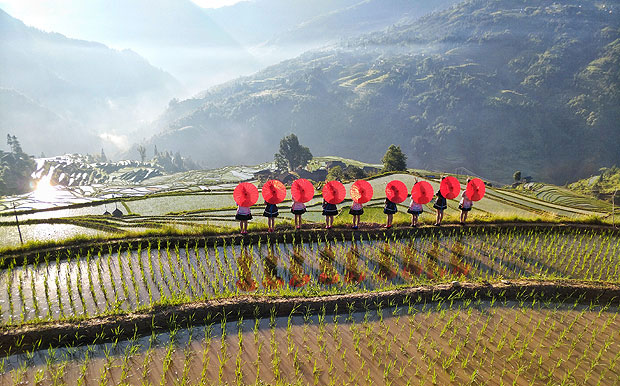 5月26日,正值从江县旅游形象宣传片《加榜梯田云上来》歌曲MV在加榜梯田景区进行拍摄,来自黔东南、黔西南等地方的中国苗族之花十朵金花相约从江,绽放在美丽的加榜梯田。