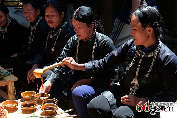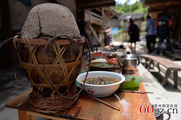 主人将尚未打开的陈酿煨酒坛放在桌边,当众揭开完整的黑泥封盖,用壮家特制的长柄葫芦勺轻轻地舀,慢慢地倒入杯中,呈暗红色的煨酒液无声无响地顺着垂沿的流线,斟满了桌上的每一个酒杯,煨酒特有的醇香一下弥漫周围。壮家煨酒让我们真正领略到琼浆玉液的风采。采风成员在壮家的酒香歌甜中抛却烦恼,乐在壮家,醉在下尧……