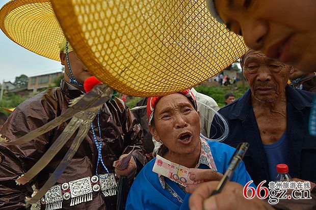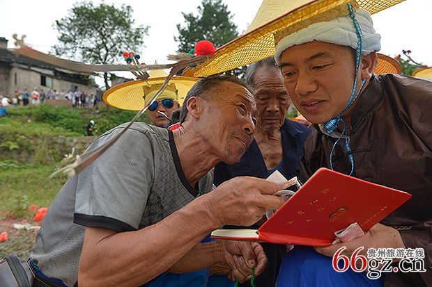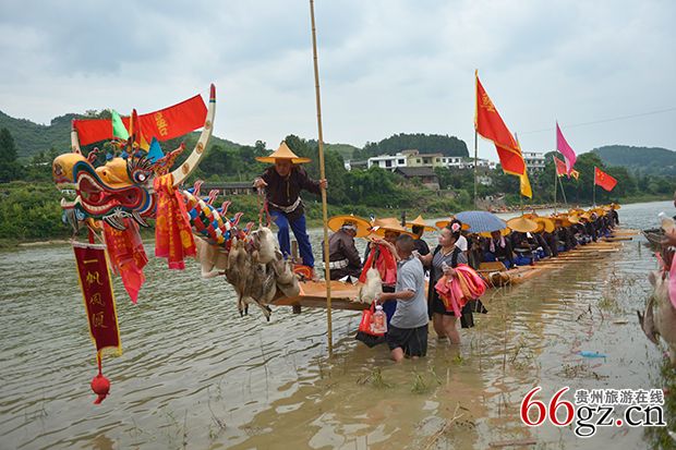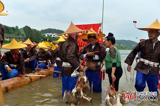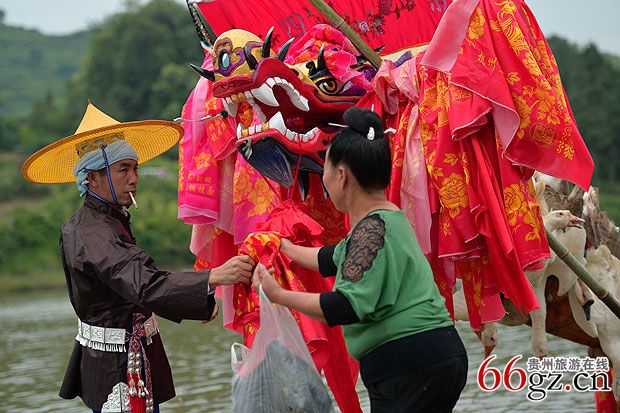 龙舟要离开寨子前往竞渡场所时,龙主亲击大鼓,鼓锣齐鸣,龙舟先绕本寨水潭激划一周,三声铁铳炮响后,各村寨的亲友都纷纷赶到河边,燃放鞭炮,唱歌接龙。接龙队伍中最重要的人物莫过于姑妈,姑妈会为龙头挂彩绸,送鸭、鹅、酒等礼物,预祝赛舟夺魁。龙头上披彩绸和挂活鸭,越多则越显威风。
