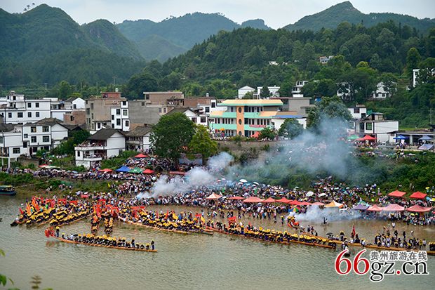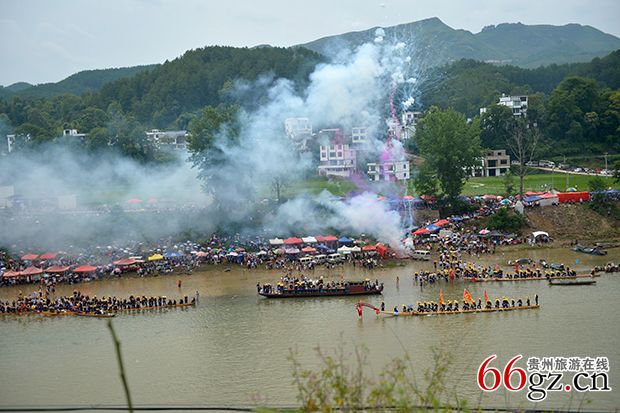 竞渡时,规则采取一对一的方式进行,败者淘汰,胜者进入下一轮。每一轮比赛,锣鼓喧天,舟上人员随着划水的节奏齐声大喊“晦——嗨”,气势磅礴,扣人心弦。一对又一对龙舟开始比赛,只听得铁铳炮咚咚响,龙舟飞快掠过江面。龙舟上鼓声频敲,催促舟上桡手用力齐划;岸边观者情绪激昂,高喊“加油”;更有人燃放炮仗助阵。竞渡结束后,每只龙舟都满载礼物缓缓而去,岸上的人们也和亲朋好友挥手告别,河面上荡起一圈圈远去的水波浪。