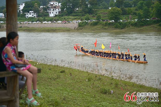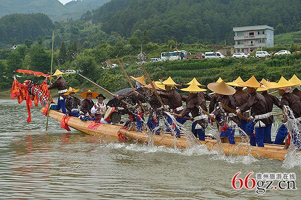别的地区赛龙舟坐着划,施洞苗族的独木龙舟赛是站在两边的子舟上划。只见桡手分成两排站在两只子舟上,略显弓箭步式兀立划桡。有三个人独排站在母舟的尾部,负责掌握龙舟方向。桡手们一律身着紫青色土布对襟苗衣和蓝色布裤,腰扎一条织花钉上银泡的腰带,头戴插着三根如凤冠银片的马尾斗笠,古朴而整洁。