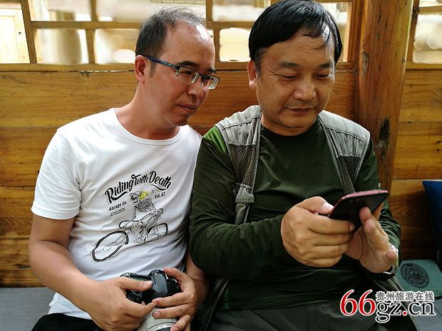 四川摄影人丁锐(左)和山西摄影人樊丽勇(右)看片交流中