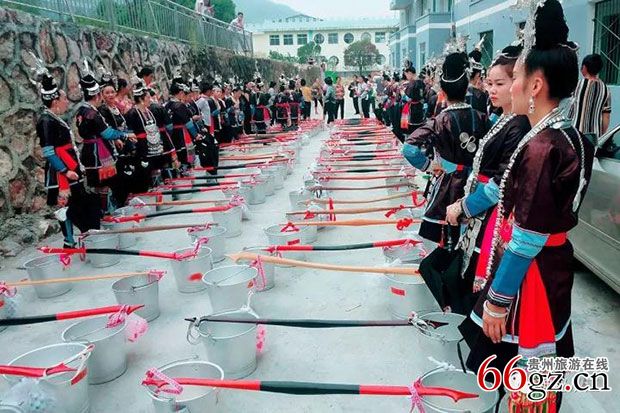 侗族姑娘们为芦笙队员和游客准备甜酒