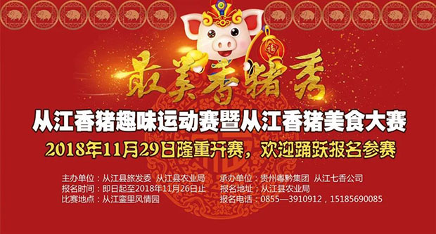 为进一步宣传推广“从江香猪”品牌,展示从江香猪特色资源优势,展现从江香猪优良品质,拓展从江香猪市场,推出一批从江香猪特色美食,丰富从江旅游市场,让更多海内游客认识从江香猪、了解从江香猪、品鉴从江香猪。将在贵州·从江第十五届原生态侗族大歌节期间举办最美香猪秀——从江香猪趣味运动赛暨从江香猪美食大赛活动。