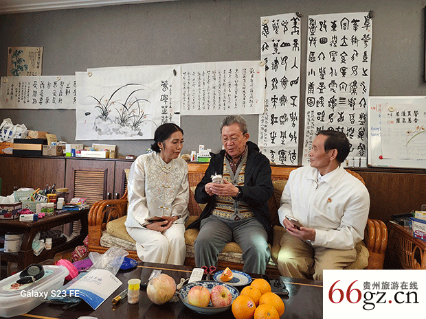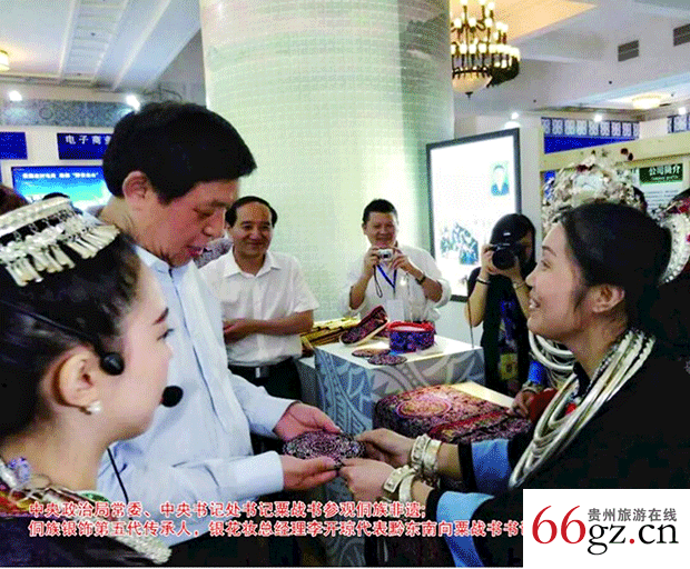 凯里学院兼职教授、侗银饰品工艺非遗传承工匠李开琼女士在向贵州省人民政府原副省长马文骏和地理博导罗万雄教授汇报卓越业绩。廖书铭 摄