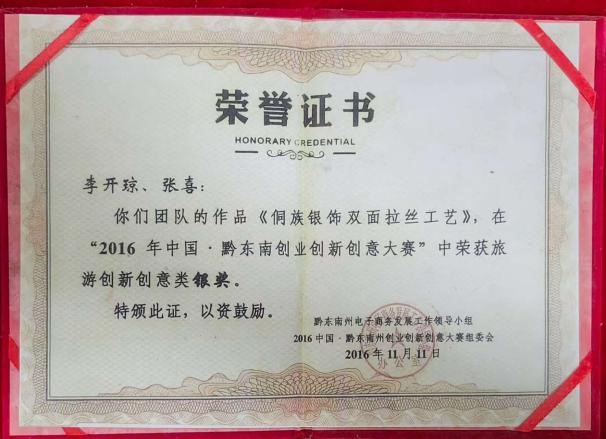 2019年,在第十五届信用中国年度盛典暨2019中国企业诚信与竞争力论坛获得“信用中国-新时代十佳诚信魅力巾帼"称号。在第十五届信用中国年度盛典暨2019中国企业诚信与竞争力论坛,获得“中国手工传统银饰最受消费者信赖匠心品牌”称号。作品《梦恋》在第五届中国.凯里银饰刺绣博览会上荣获银饰类银奖。2022年,贵州省商务厅、贵州省电子商务产业发展协会颁发“贵州电商”直播大赛优秀奖。2021年8月,《雪花银扇》在贵州省版权局进行作品登记。