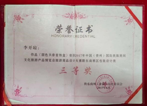作品《国色天香首饰盒》荣获2017年中国(贵州)国际民族民间文化旅游产品博览会旅游商品设计大赛黔东南赛区包装设计类三等奖。