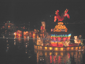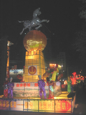 今年春节期间,都匀举办水陆两栖大型灯展,在剑江河上、文峰路、民族路和人民广场精心策划设计了造型各异盏大型灯饰,有“雄鸡报晓”、“龙腾虎跃”、“少数民族服饰”“芦笙和铜鼓”、“中国优秀旅游城市标志”和“毛尖茶标志”等,主要突出地方民族文化特色。都匀水陆两栖大型灯展于2月12日和18日先后两次走进了中央电视台,在社会上产生了良好的反响。 (图为:“中国优秀旅游城市标志”和 “雄鸡报晓”)