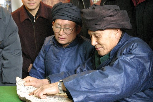 这是两位“水书先生”在向有关专家解读水书(2月21日摄)。