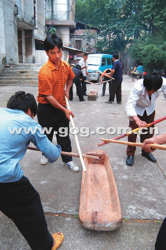一般有老人过世的时候,村民们才会跳起这个舞蹈,以示悼念。道具就是村民们打年粑用的粑槽和粑棍。一个粑槽旁边要站四个人,每人手中都拿有粑棍。随着皮鼓的节奏,棒子在他们手中“挥舞”,与粑槽形成摩擦,通过不停地换位,达到“花样百出”的效果。动作干净利落,刚劲有力,结构严谨、节奏鲜明,展现出这个男子群舞的阳刚之气。村支书王国仲是这支队伍的指导,“我们到都匀都表演过好多次了,还教附近的武警跳过这个舞呢,外地人都非常喜欢呢。”