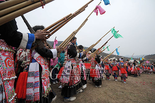 跳园节日中,来自草原乡各寨苗族姑娘小伙会在之前形成一个或几个队,每个队列一般在十人左右,由一个吹奏芦笙较好、迈芦笙步伐标准的人作领队,之后或按身高排列或按吹奏芦笙技能排成一列;姑娘们则要排成排走在芦笙队伍前,但同样要由一个听懂芦笙曲调能并够随曲调迈动步子的人作领队,其后按身高依次排列站成一排。姑娘走在前,小伙吹着芦笙在后,围绕一个圆形迈芦笙步子。节日中,无论男女青年,均着盛装上场。