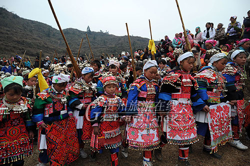 跳园的由来传说在远古时期,天地昏暗似浑为一体,人们为了不走失闪而聚集在一起,同时,通过各种方式以惊动上天获取光明。男人用竹制作成能芦笙吹奏,妇女则穿上耀眼的服饰并配上清脆悦耳的银铃随着芦笙的曲调迈动步子。据说,人们刚开始跳园时是沿着逆时针方向行走,天依旧昏暗一直没有丝毫变亮的痕迹。后来,在正月初六这一天,同胞中一个青年人吹着芦笙按顺时针迈步,突然天空发生了微妙变化,渐渐露出丝丝亮光,人们喜出望外,欢天喜地随着这个年轻人吹起声音洪亮的芦笙,姑娘们则更加踊跃地一起随着芦笙调子迈出轻盈的步伐。