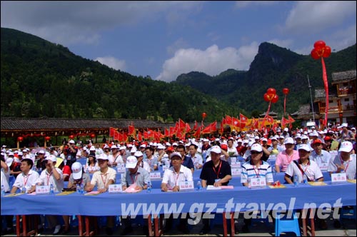 贵州省旅游局副局长李三旗在会上发表讲话平塘县委书记严肃在会上致欢迎辞平塘县县长毛有智在会上宣读《首届黔南州旅游产业发展大会平塘宣言》会议在美丽的掌布国家地质公园举办